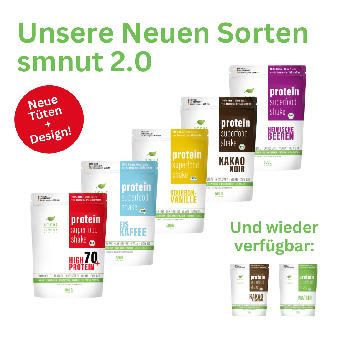 smnut ist All-In-One: Lebensnotwendige Proteine und besonders nährstoffreiche Superfoods in einem Produkt. So unterstützen dich die Proteinprodukte von smnut auf deinem Weg: Egal ob Muskelaufbau, Gesundheit, Naschen oder Abnehmen. Mit smnut brauchst du nicht mehr unzählige Produkte kaufen. Unsere pflanzlichen Protein Superfood Shakes sind vielseitig einsetzbar und auch perfekt für unterwegs. Mach dein Leben einfacher!